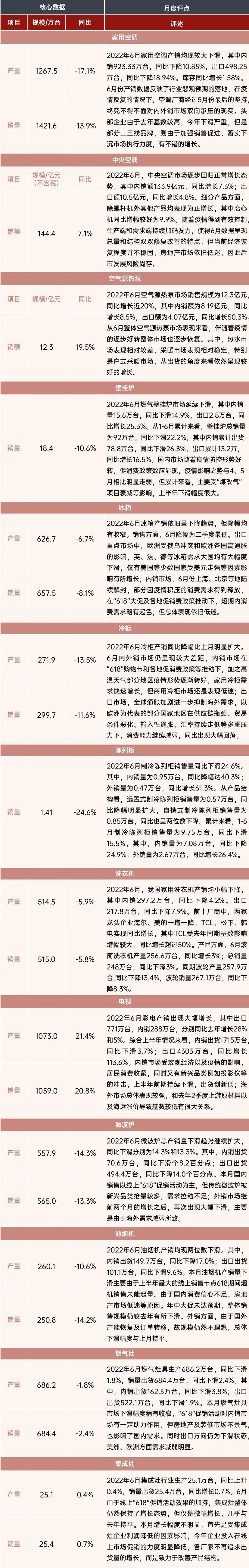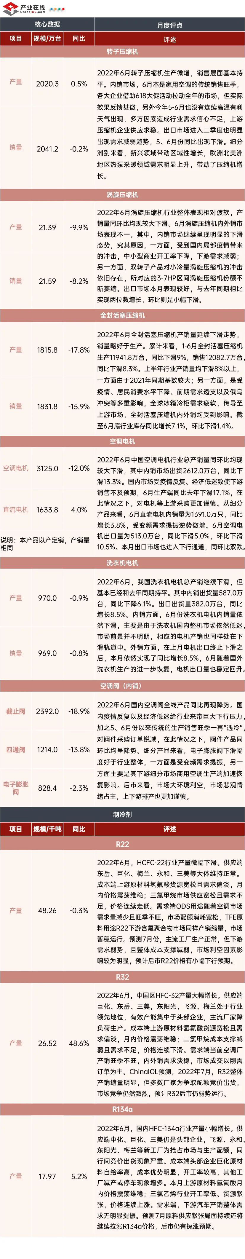 據(jù)產(chǎn)業(yè)在線數(shù)據(jù)顯示,2022年6月的產(chǎn)業(yè)鏈?zhǔn)袌鲆廊谎永m(xù)低迷,疫情動態(tài)清零目標(biāo)之下,雖然有多種政策提振,但對終端消費(fèi)拉動效果并不明顯。對比來看,中央空調(diào)和空氣源熱泵表現(xiàn)較好;細(xì)分品類市場也不乏亮點(diǎn),滾筒洗衣機(jī)、直流電機(jī)等高效節(jié)能產(chǎn)品表現(xiàn)強(qiáng)勢,制冷劑產(chǎn)品中R32出現(xiàn)了近50%的大幅增長。